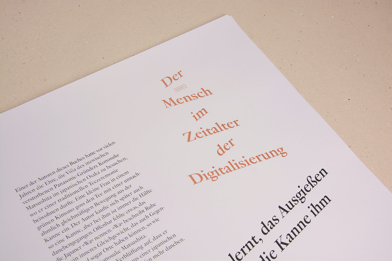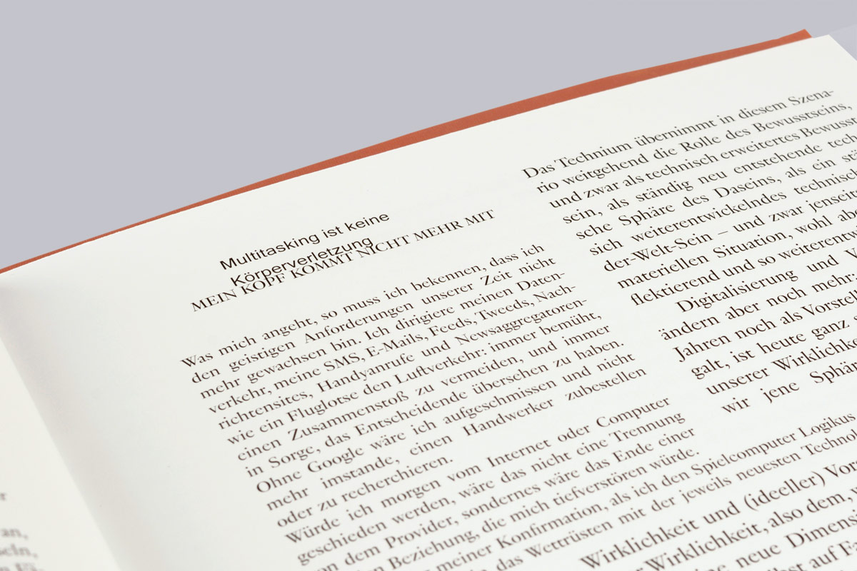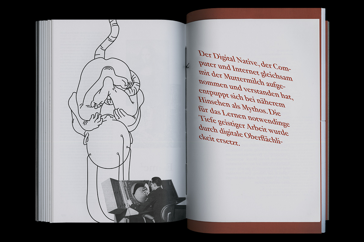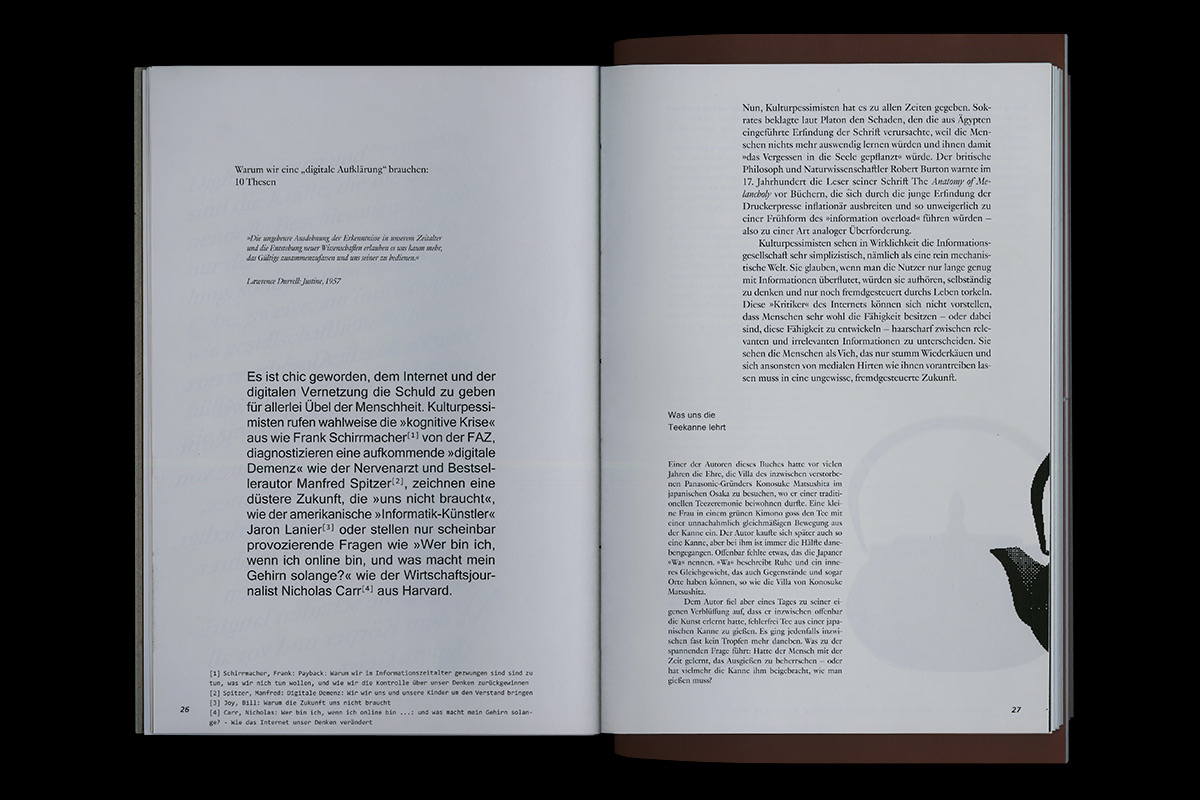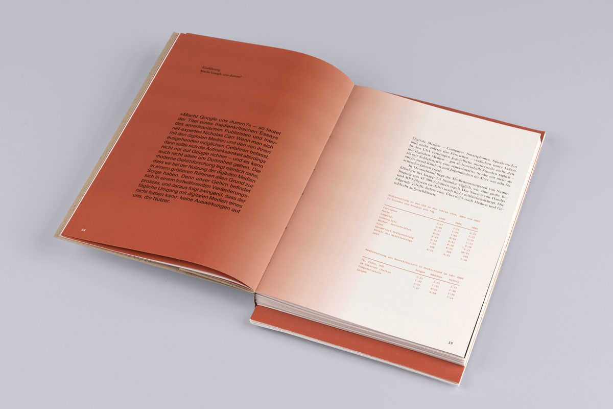 For my bachelor thesis I chose a sophisticated approach to designing the layout by splitting up the books structure and making use of playful typography and graphical information. The reader is guided through a kind of dual narrative about the pros and cons of the digital media.