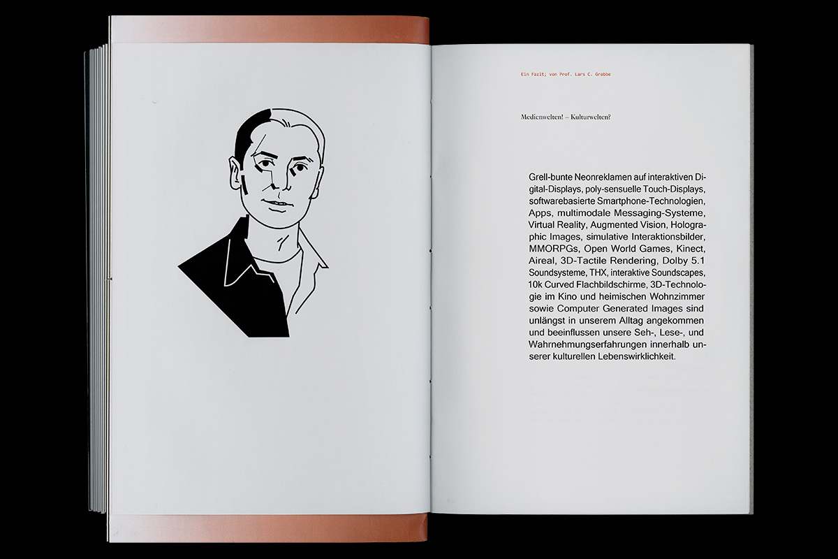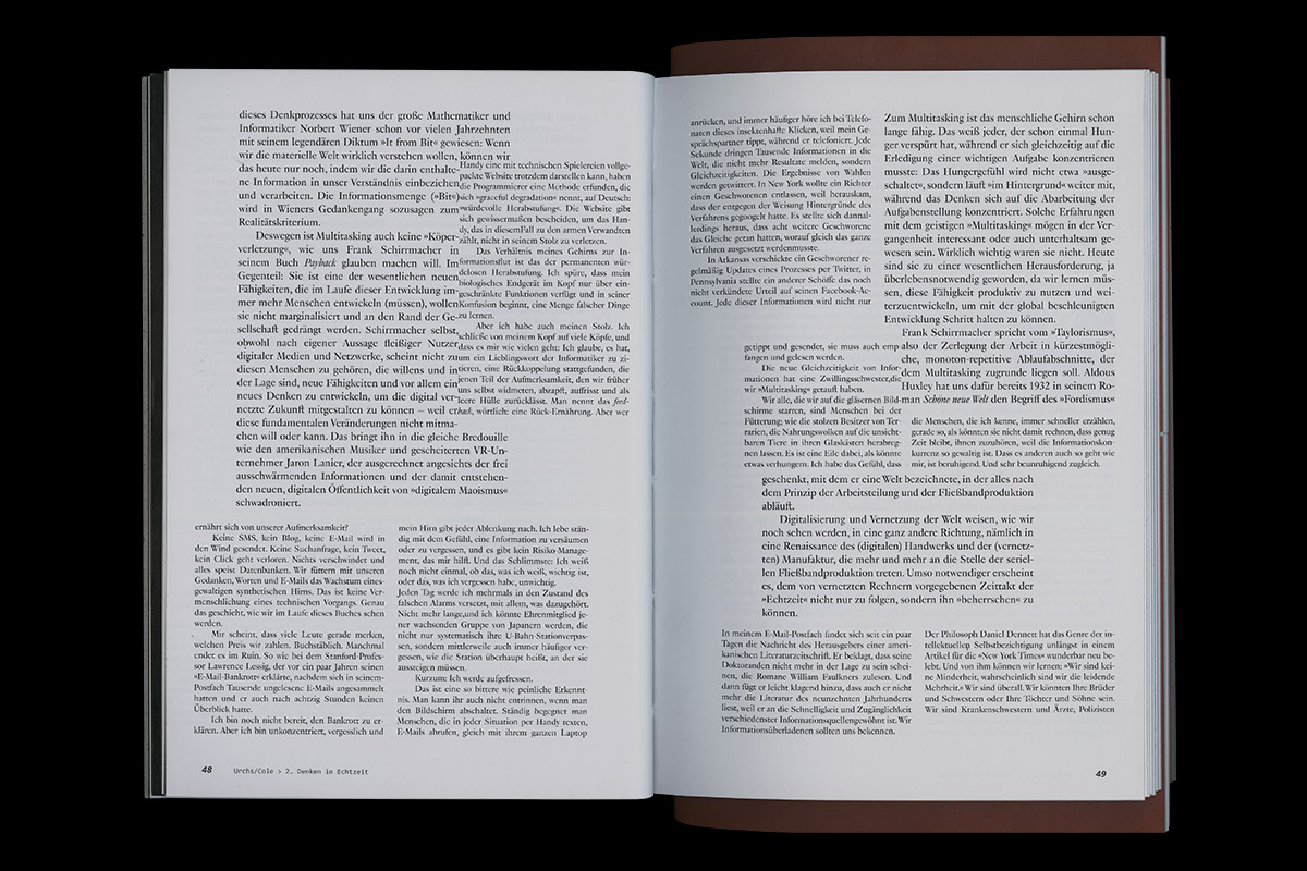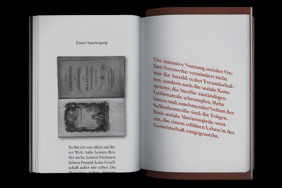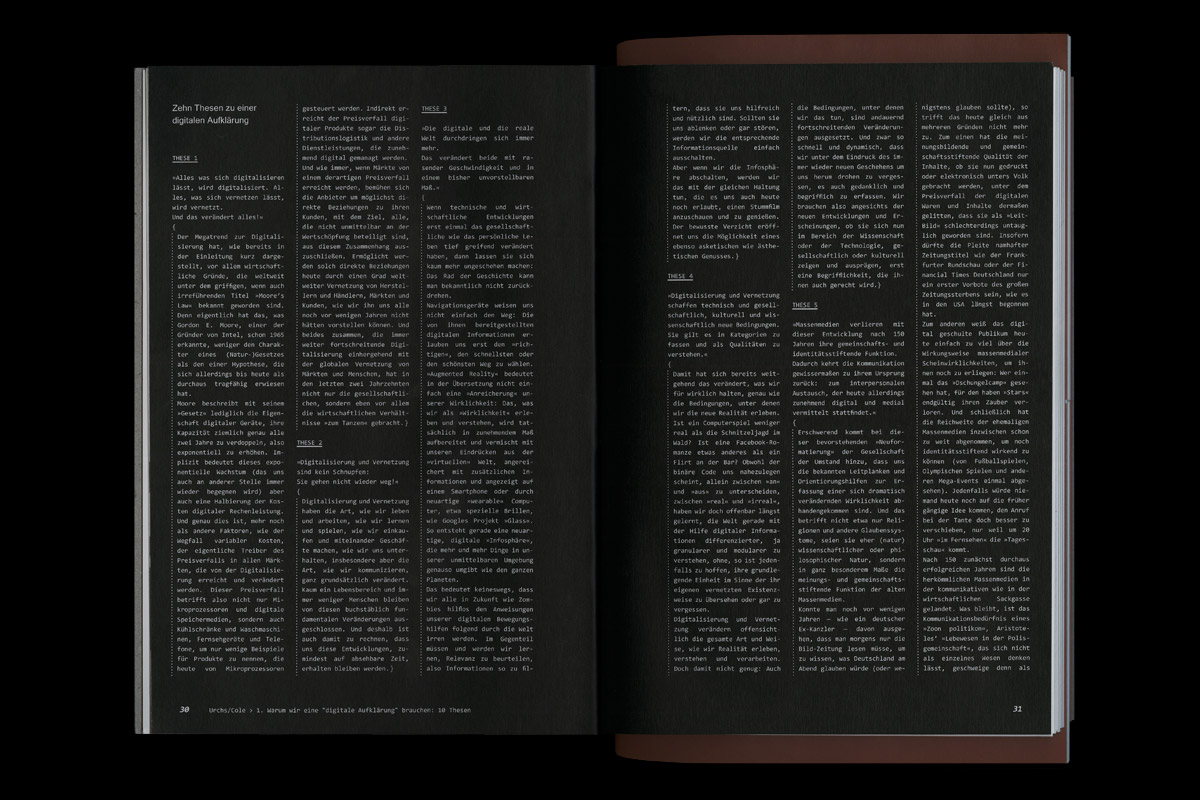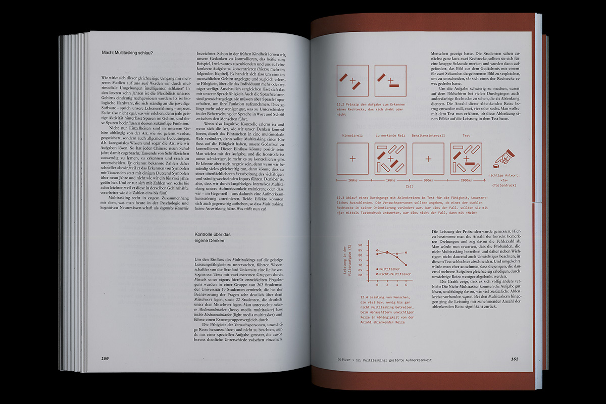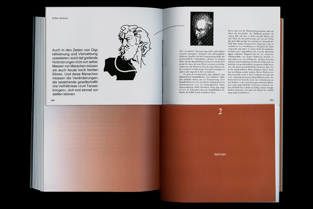 For my bachelor thesis I chose a sophisticated approach to designing the layout by splitting up the books structure and making use of playful typography and graphical information. The reader is guided through a kind of dual narrative about the pros and cons of the digital media.