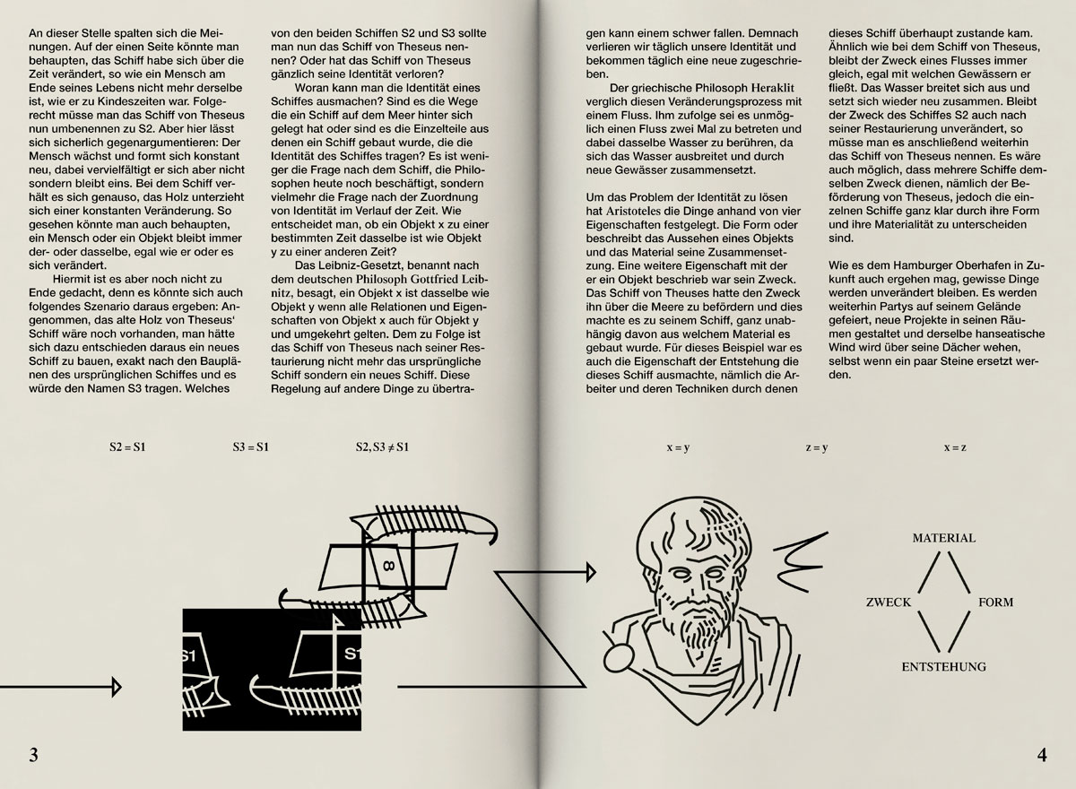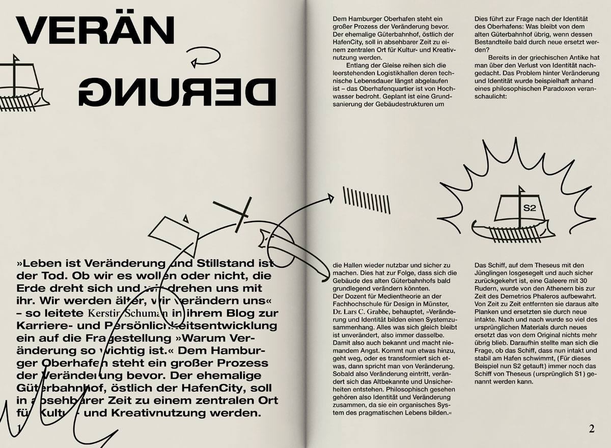 During the INDIECON 2015 design festival in hamburg I took part in the four-day-long workshop by the creators of Froh! magazine. The participants were challenged to create a magazine about the Oberhafenquartier (adress 41–43) in four days from scratch. The overall theme was going to be “Veränderung” (change) and so I decided to write about an old exemplary myth Ship of Theseus.