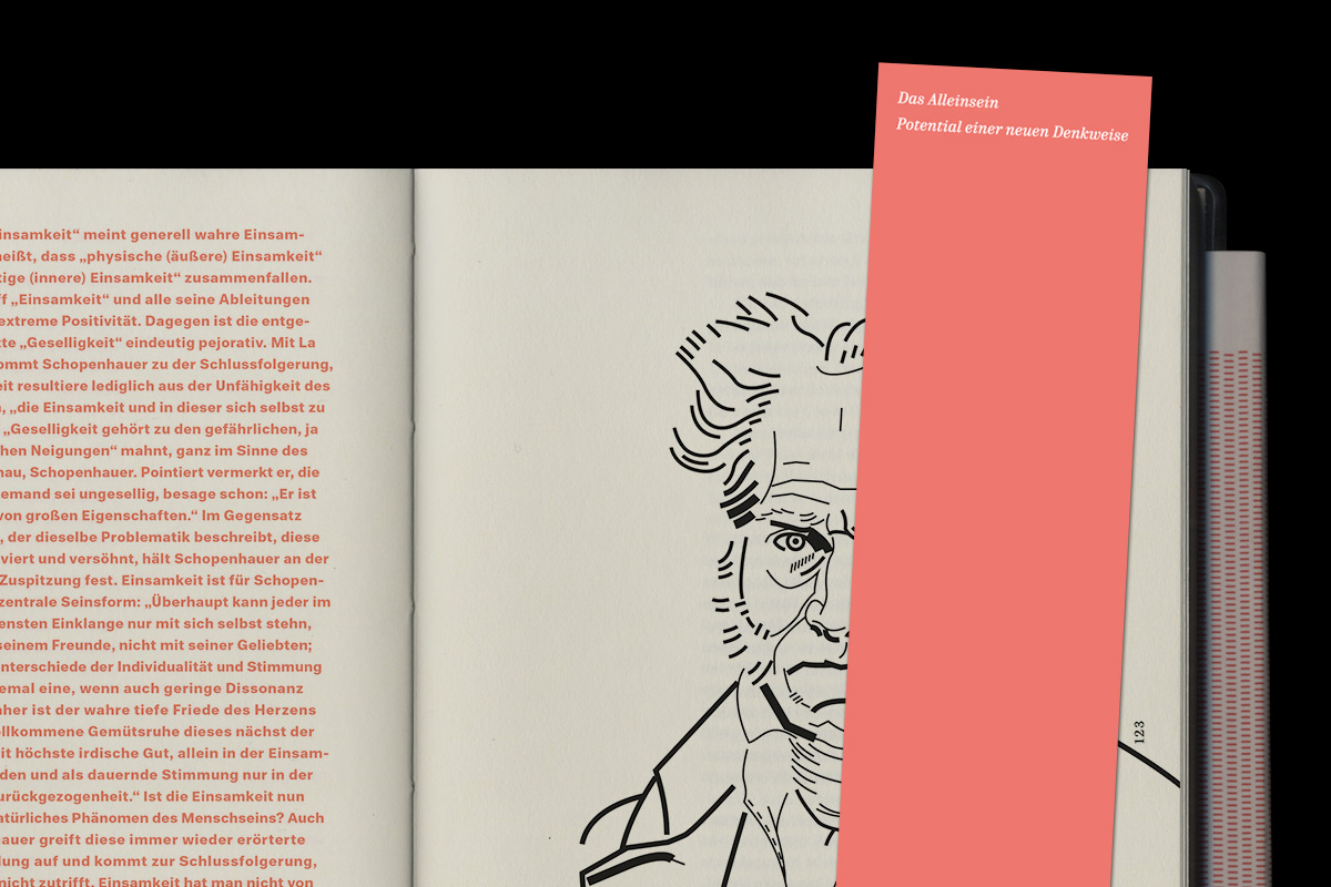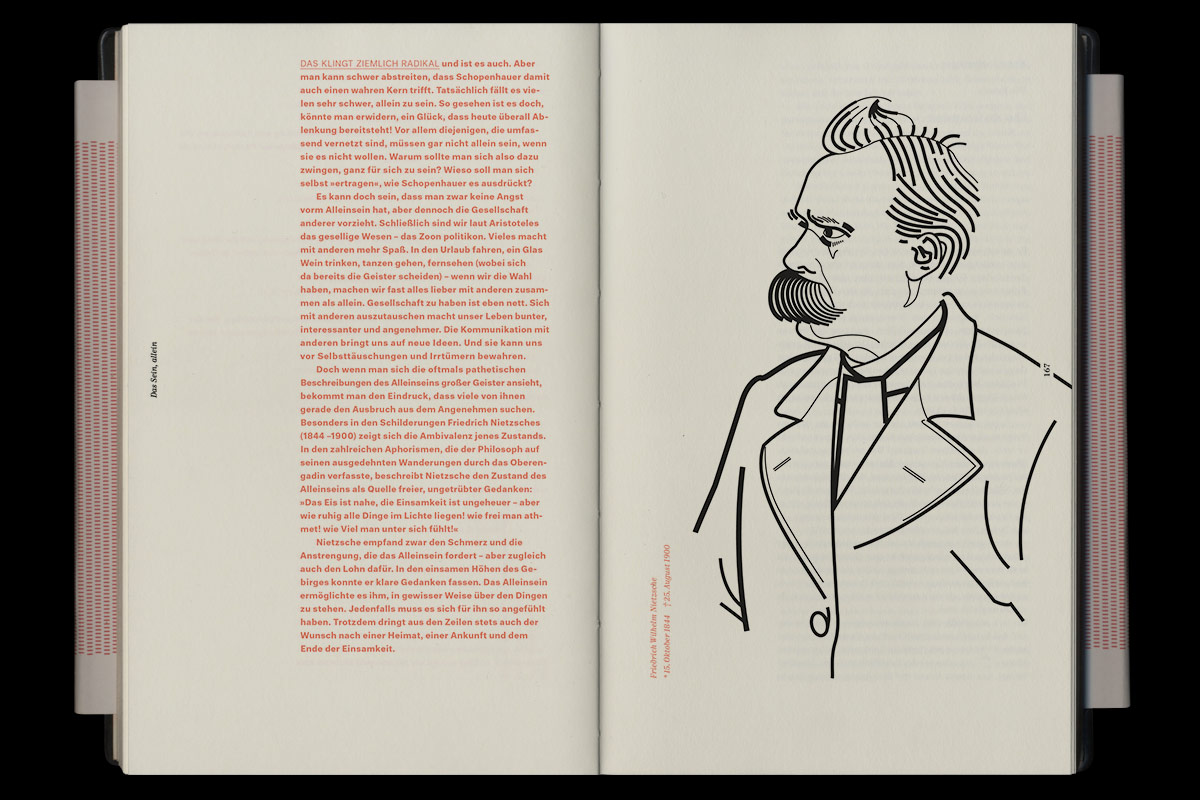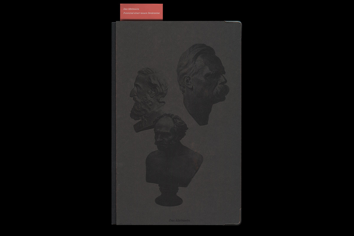 Das Alleinsein was created during my seventh semester studying at MSD / Münster School of Design as part of a self-initiated Buchkunst project. The binding is sewn by hand and the cover features the laser-engraved images of Friedrich Nietzsche, Henry David Thoreau and Arthur Schopenhauer.