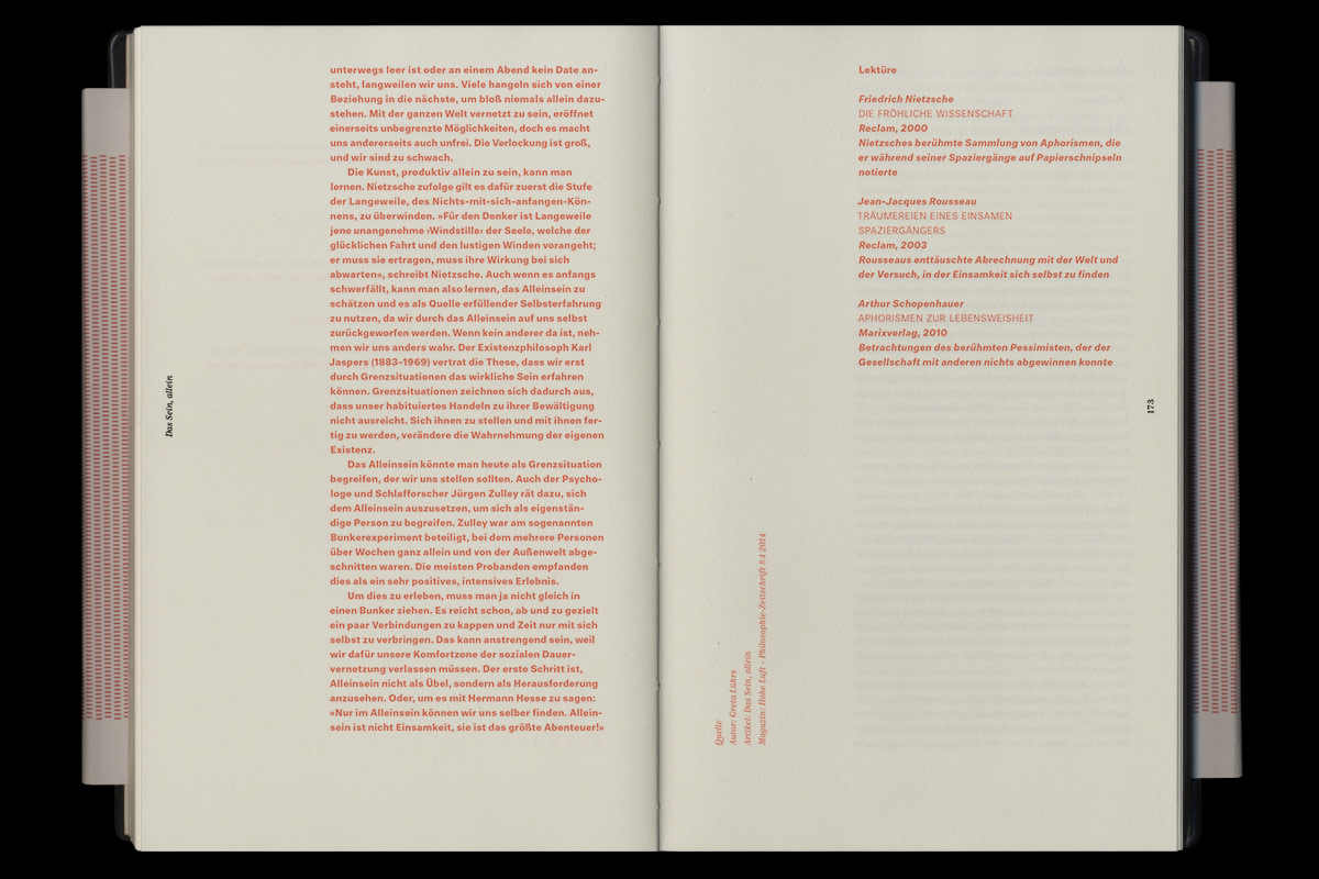 Partly inspired by Martin Heidegger’s writings about Das Sein and Henry Thoreau’s Walden, Das Alleinsein focuses on being alone on one’s own accord – a state of mind seldom adressed in contemporary culture. Consisting of numerous articles, essays and texts spanning from the 1850’s to 2013, Das Alleinsein provides not only a practical but also deep understanding of how to confront your inner self and why this might be beneficial.