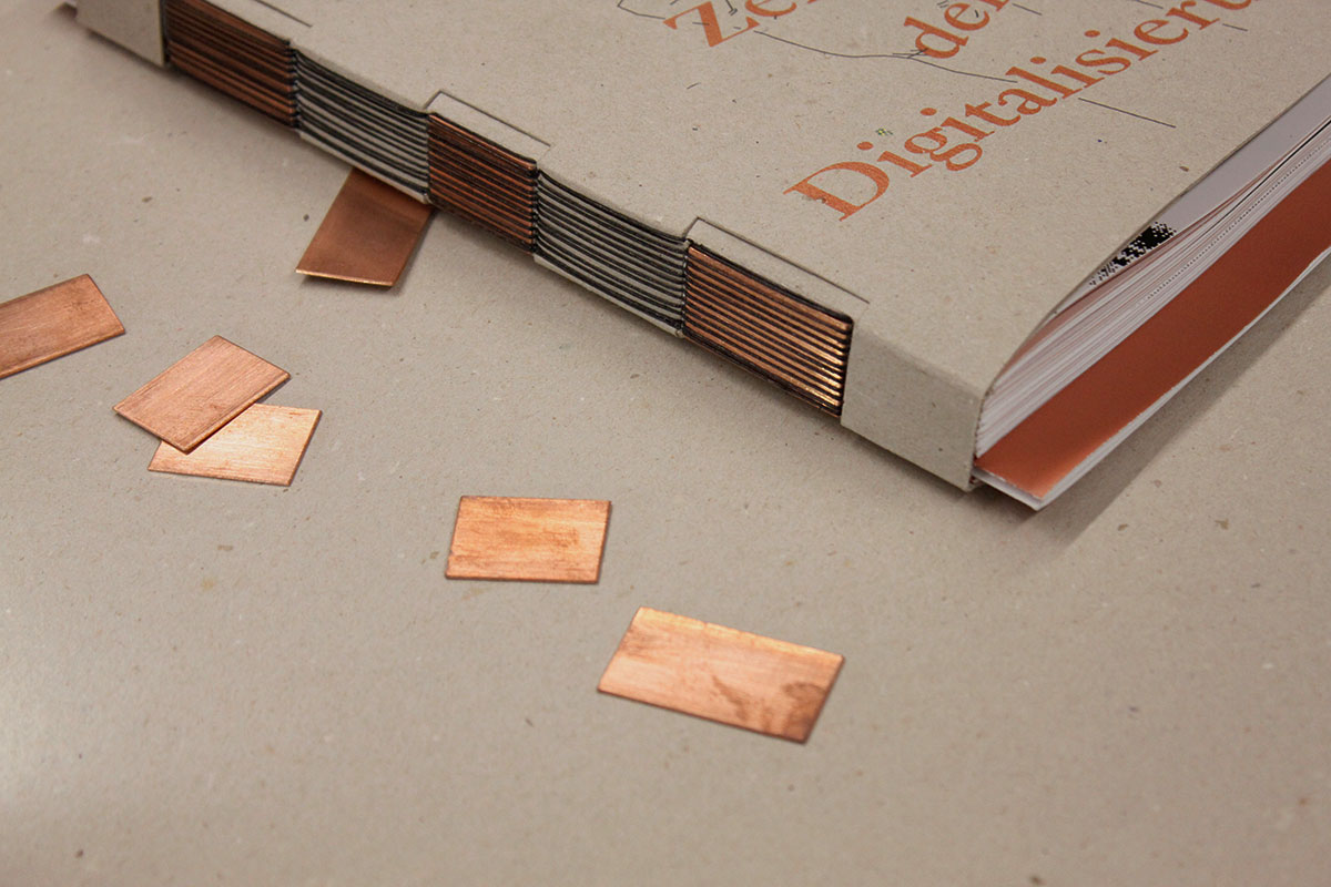 The book is bound by a custom type of long stitching supported by copper plating and the cover features a silkscreen print with copper acrylic paint.