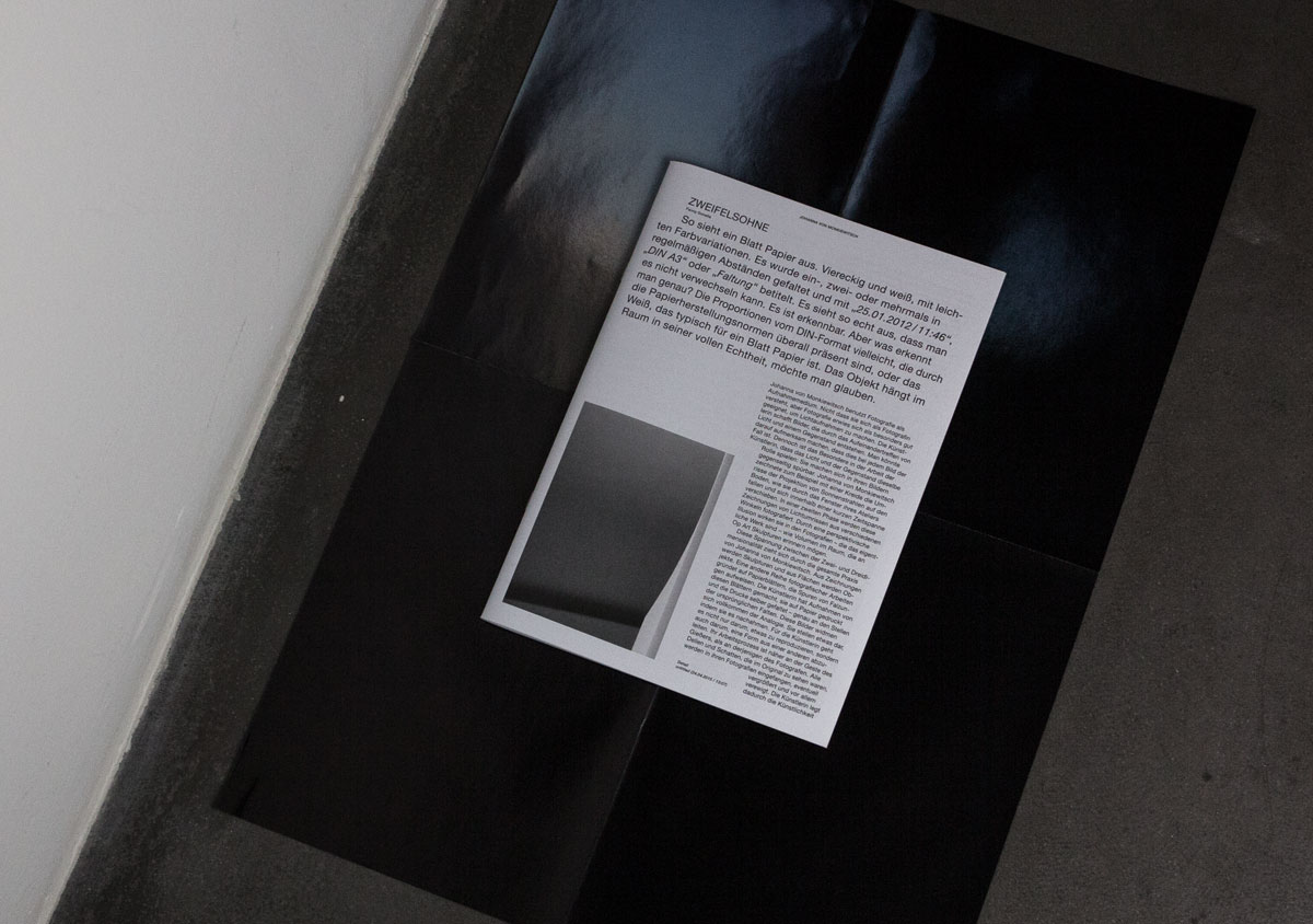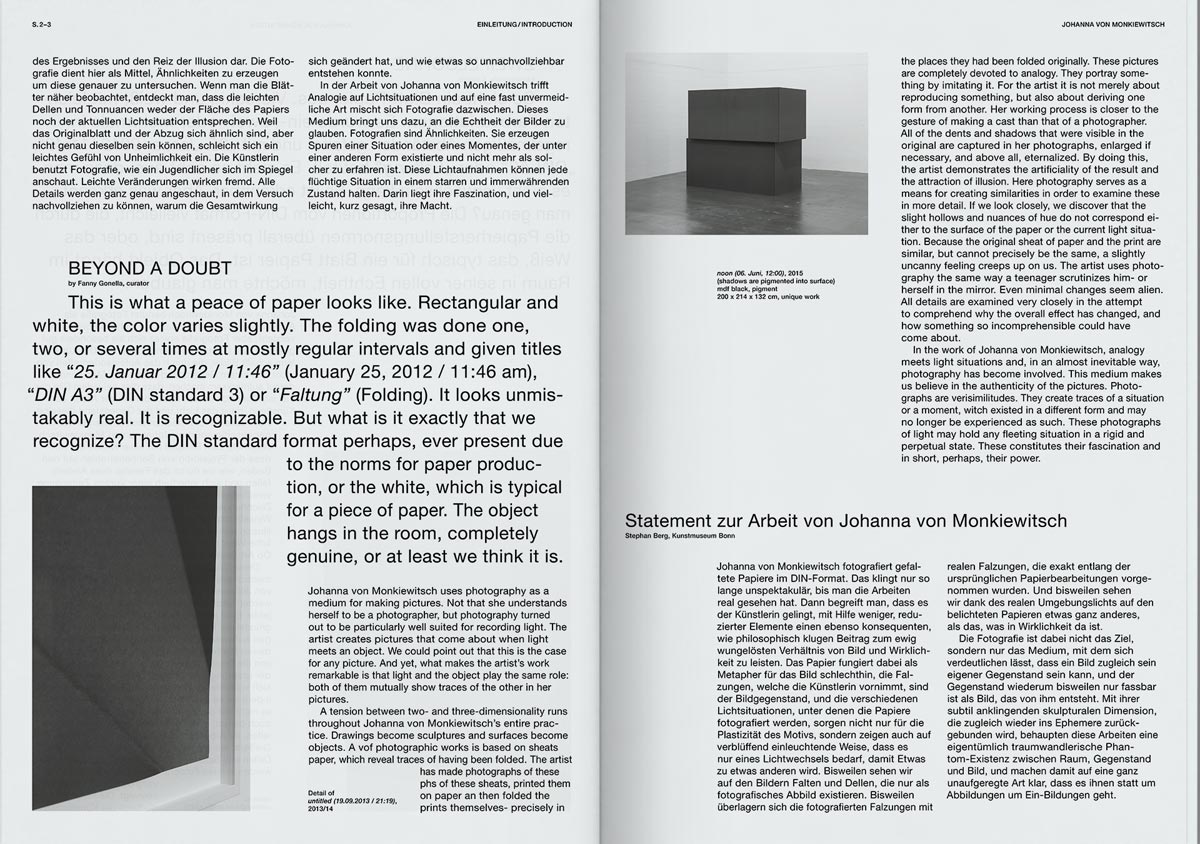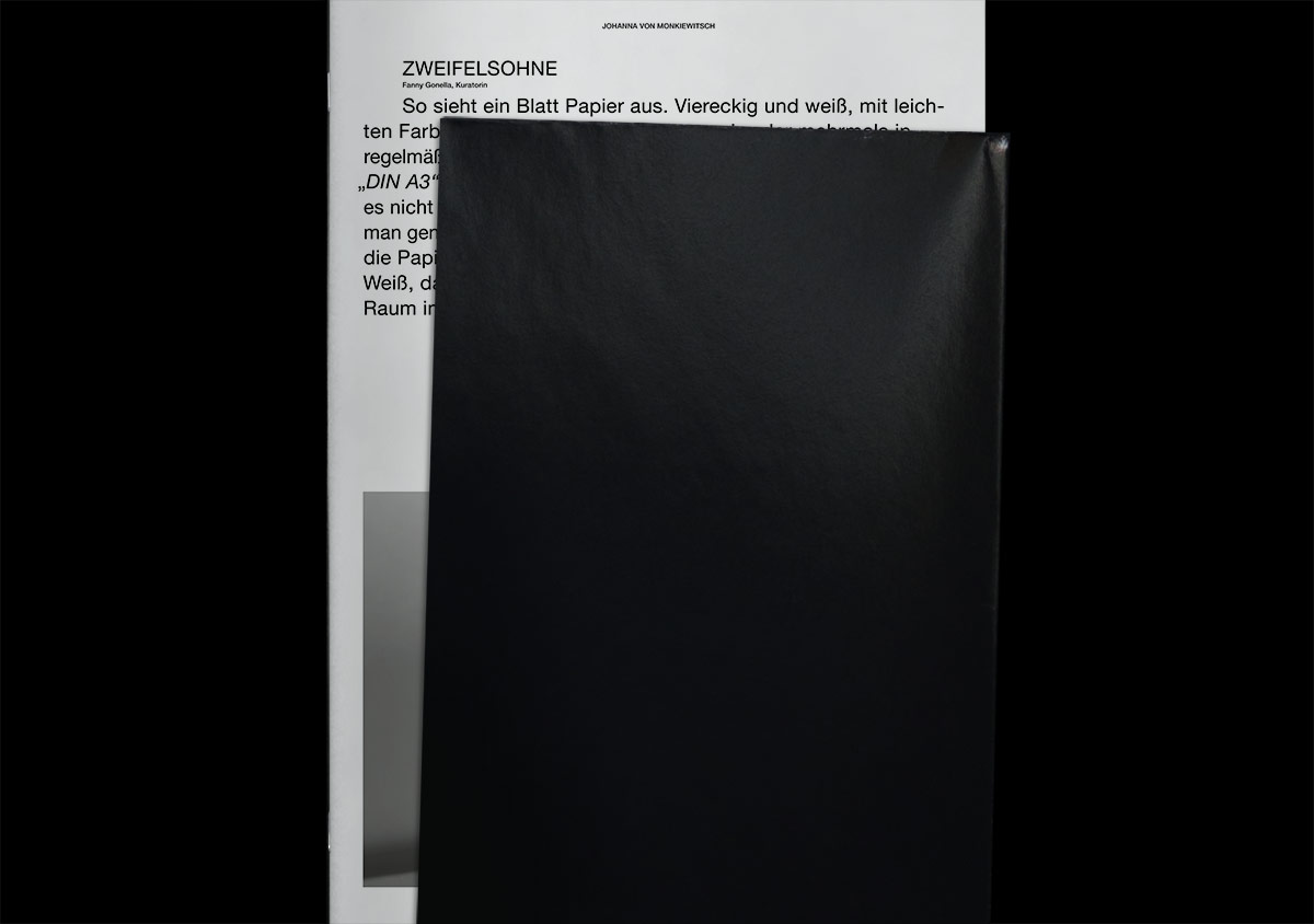 Johanna von Monkiewitsch is a cologne-based artist whose work, for the time being, focuses strongly on light and perspective. For her 2017 printed portfolio she choose a variety of works, most of them being photographs of light on paper. The brochure turned out to be a work of it's own, a limited edition of 250 complete with a Din A2 folded photograph in which the brochure is enveloped.