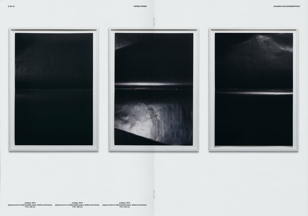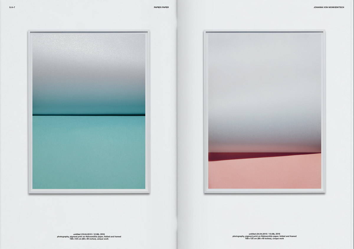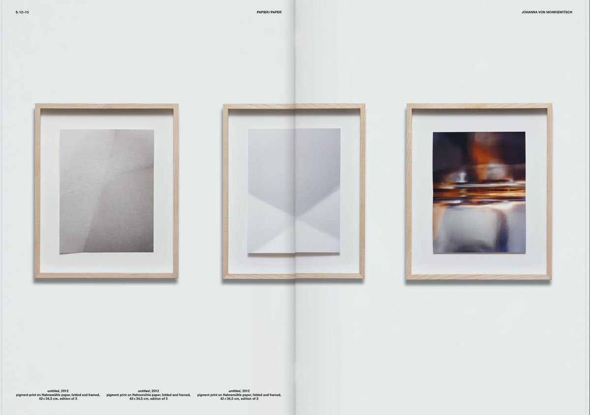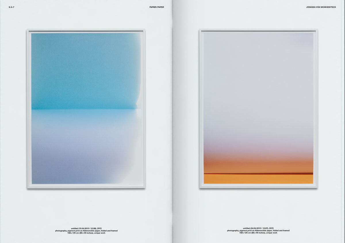 Johanna von Monkiewitsch is a cologne-based artist whose work, for the time being, focuses strongly on light and perspective. For her 2017 printed portfolio she choose a variety of works, most of them being photographs of light on paper. The brochure turned out to be a work of it's own, a limited edition of 250 complete with a Din A2 folded photograph in which the brochure is enveloped.