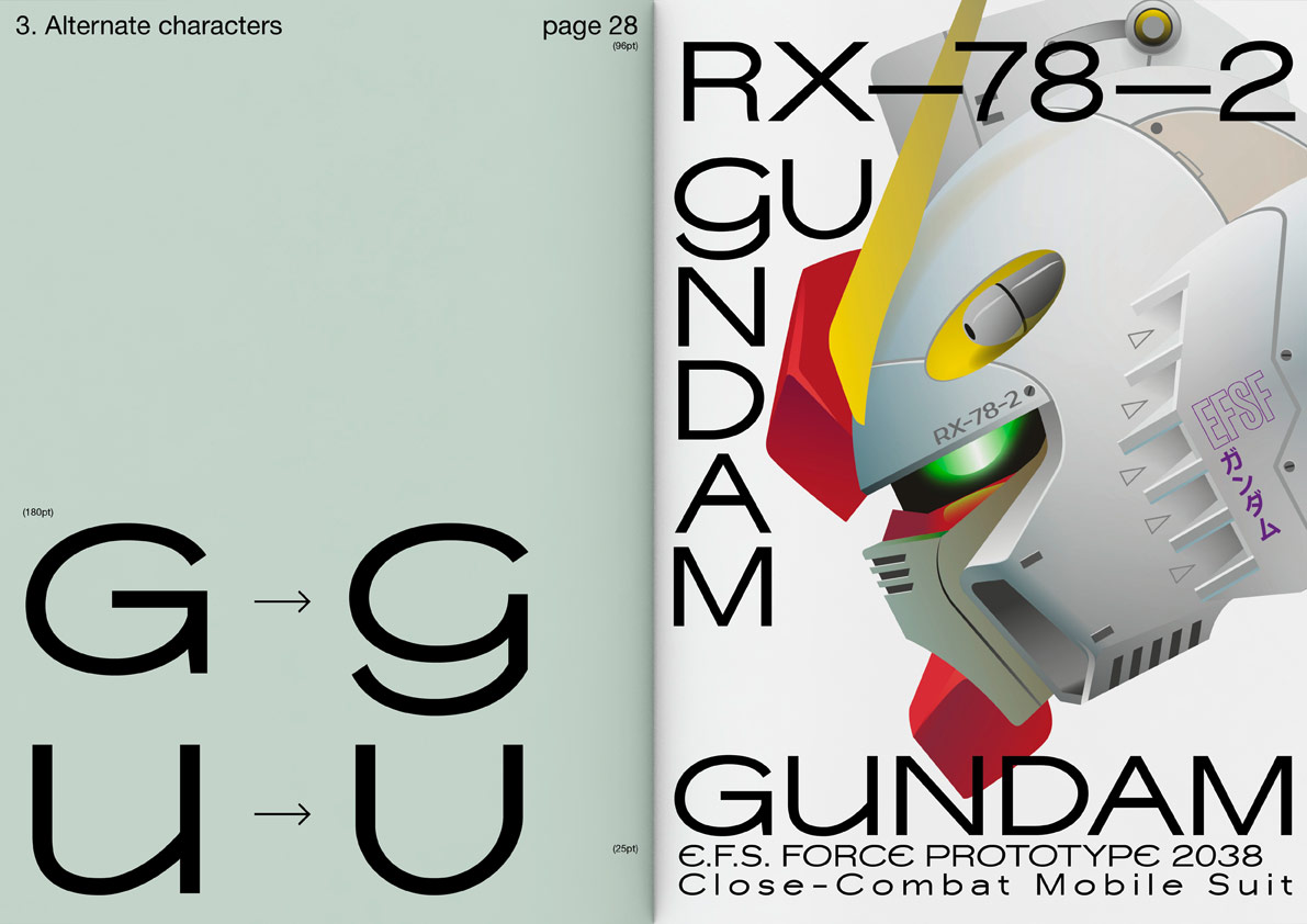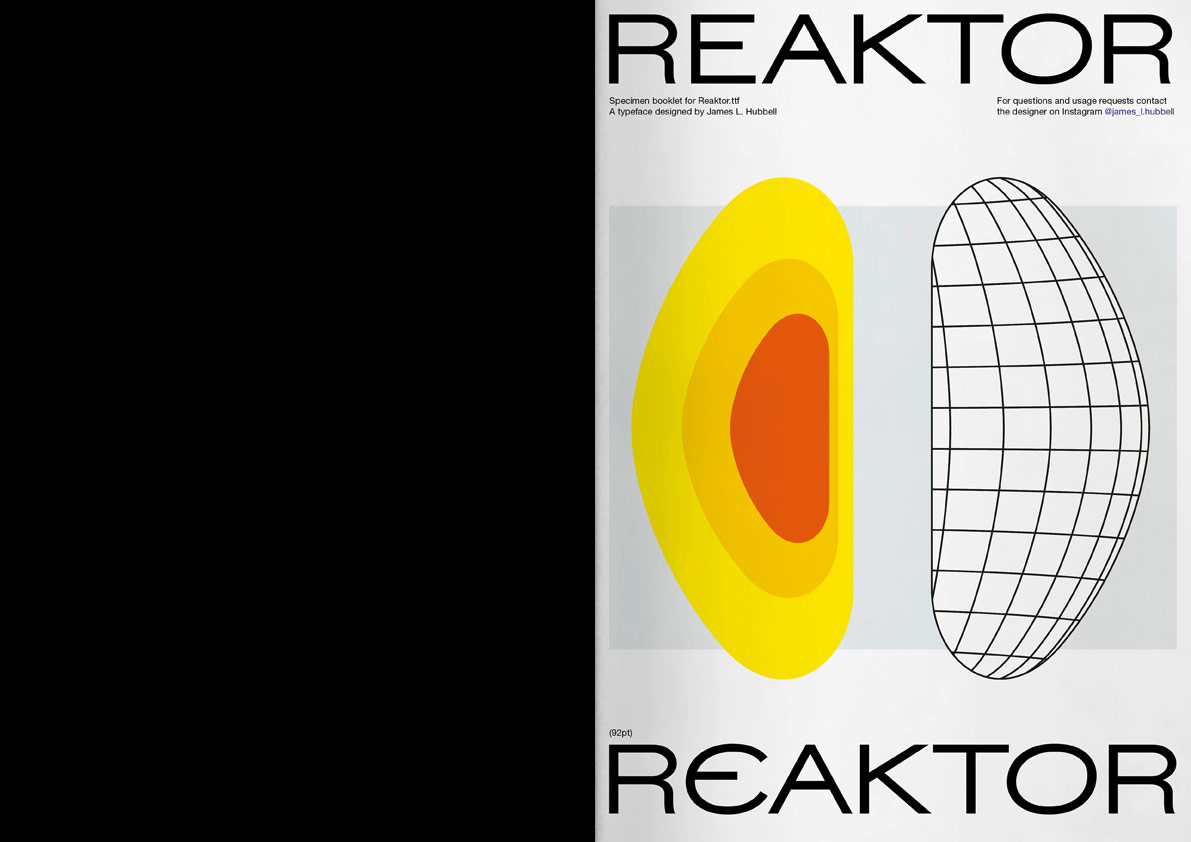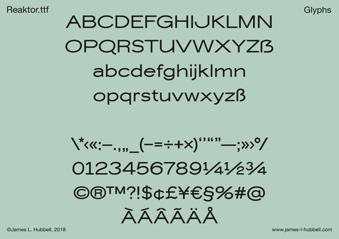 Reaktor is a sans-serif display typeface with extended characters and a slightly tilted axis in the curves. It comes equiped with few alternate glyphs and a capital sharp 's' – or 'Eszett' – as is custom in the german language. Reaktor is currently considered a work-in-progress and so far consists of a single weight and 185 characters. Featured on the cover of the printed specimen is a graphical reduction of the ITER (International Thermonuclear Experimental Reactor) based on the russian 'tokamak' configuration.