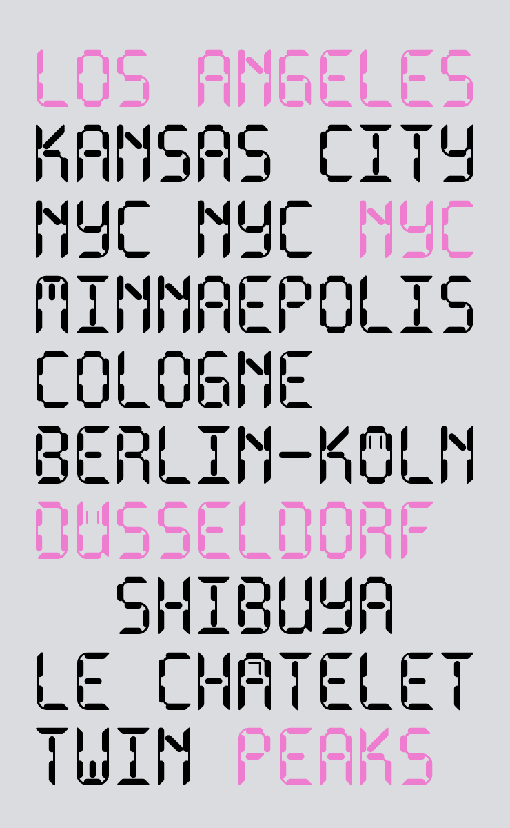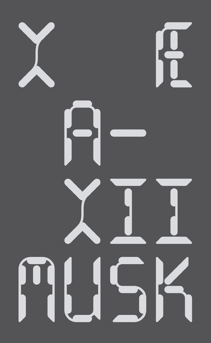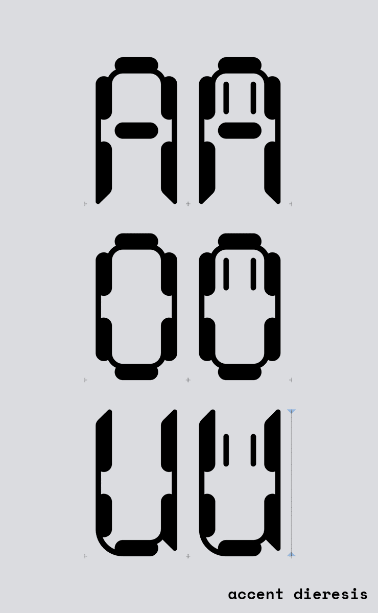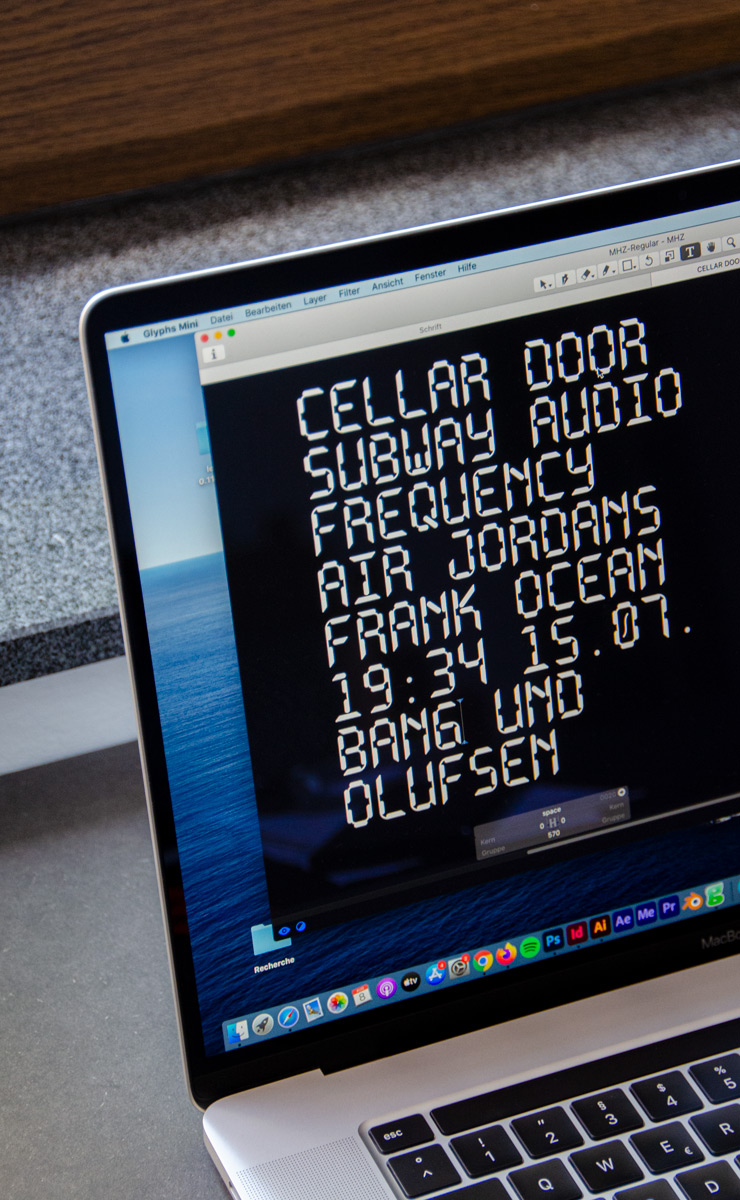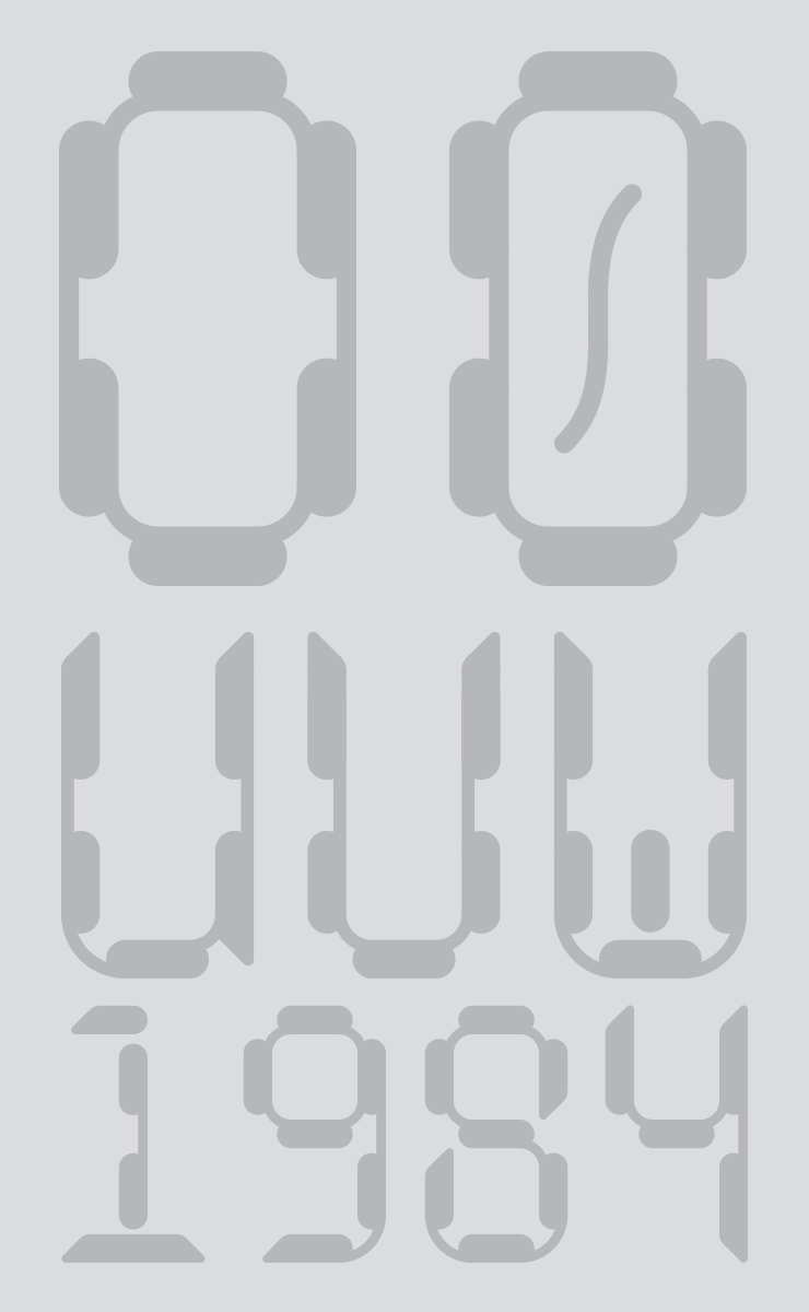 Inspired by LED illuminated digits on alarm clocks and car radios, MHZ (working title) is constructed on a geometric grid which gives it it's distinct character. Every glyph is equal in dimensions, making this a monospaced display font. MHZ is still in it's early stages of becoming a fully developed typeface, but basic latin characters and numbers as well as mathematic symbols and punctuation may be available upon request.