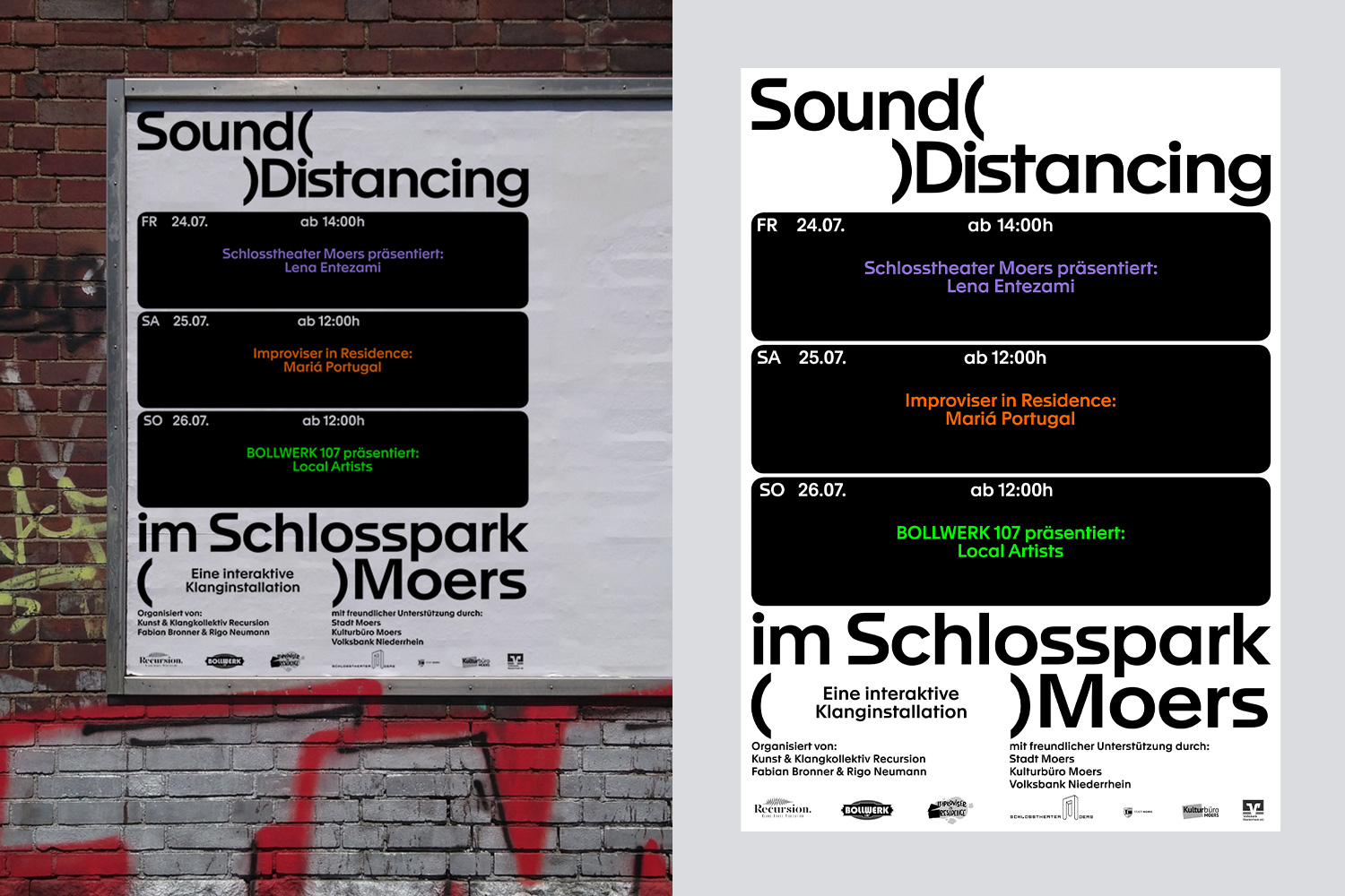 Sound Distancing resolves around an interactive sound installation in the Schlosspark Moers. The AI-operated camera system and directional speaker construction was brought to life by the @recursion collective in cooperation with Fabian Bronner and Rigo Neumann. Performances include @lena entezami, @mariá portugal and various local musicians presented by @bollwerk107.